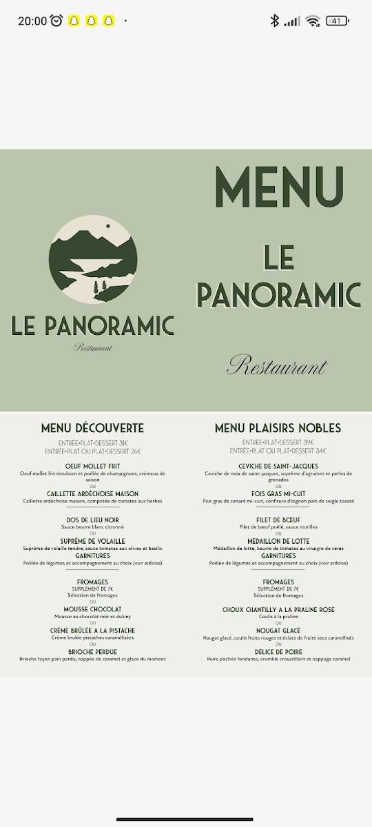 Restaurant Le Panoramic offers an exquisite French fine dining experience nestled in the heart of Ozon, France. The cuisine here is a masterclass in simplicity and depth, showcasing fresh, seasonal ingredients crafted with delicate precision. The Menu Découverte delights with dishes like the crispy oeuf mollet frit, paired with creamy seasonal vegetables, and the traditional caillette ardéchoise maison with herb-infused tomato compote. For those seeking a noble indulgence, the Menu Plaisirs Nobles impresses with refined options such as the zesty ceviche de saint-jacques, rich foie gras mi-cuit, and succulent filet de bœuf accompanied by morel sauce. Each plate balances rustic charm with exquisite sophistication, perfectly complemented by an extensive wine list. The warm and attentive service, combined with breathtaking views from the terrace, creates an unforgettable dining atmosphere. Whether savoring the vibrant flavors or the elegant presentation, Le Panoramic is truly a culinary gem to cherish.